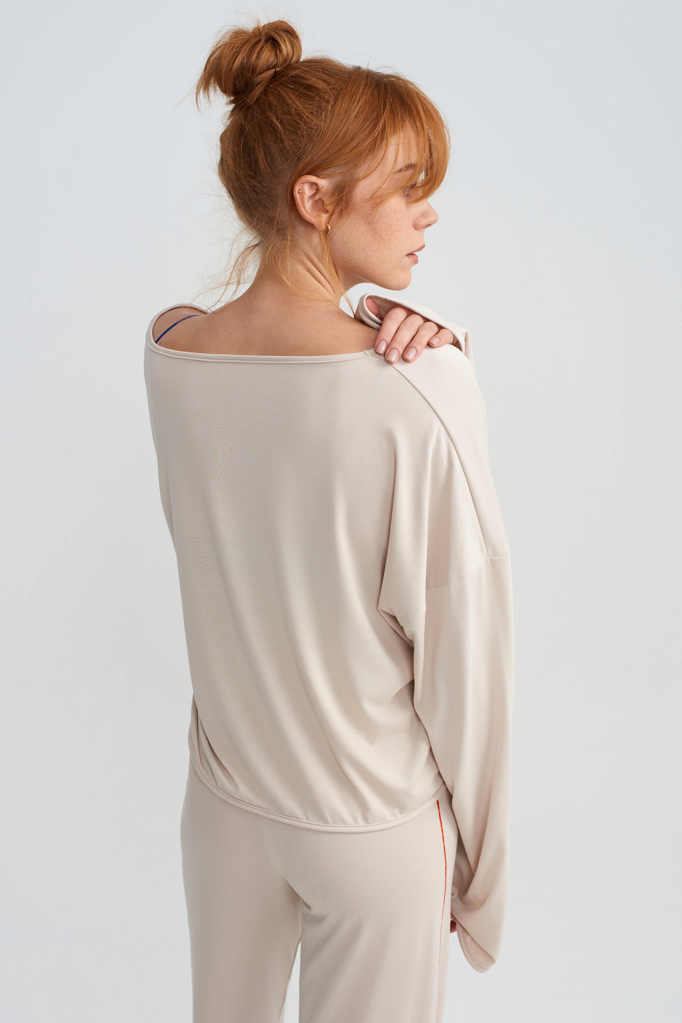 This long-sleeve top with a wide U neckline gently drapes over the body with its light and fluid structure. The open neckline subtly highlights the shoulders, while the relaxed fit allows for ease of movement throughout the day.