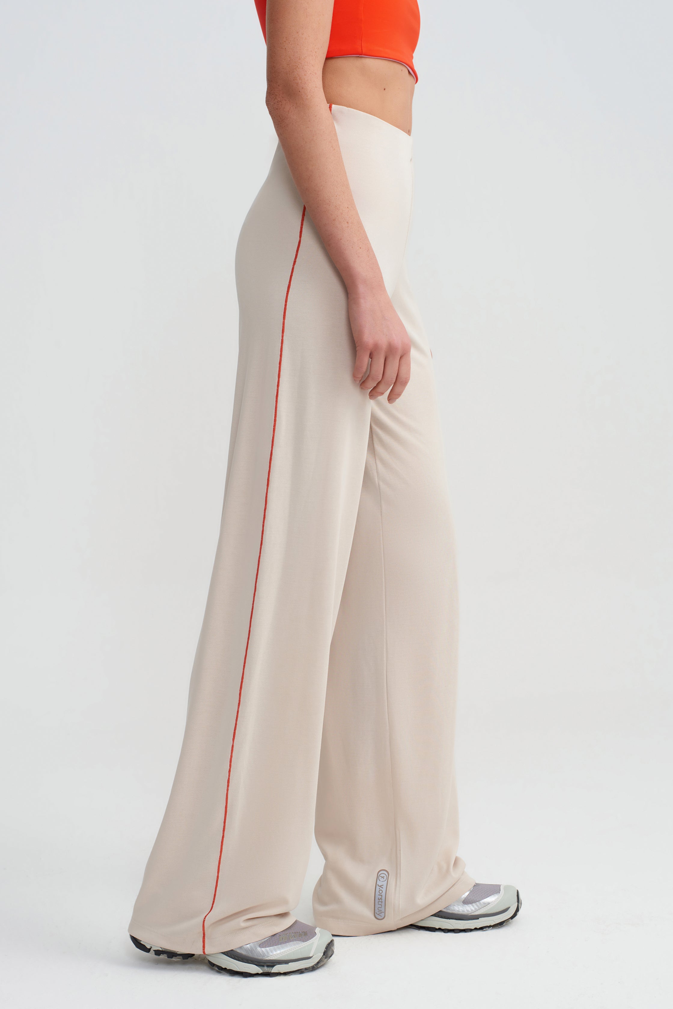 Our best-selling STUDIO PANTS feature a decorative pomegranate-toned stitch detail along the outer leg. Designed with a high-rise waist and a relaxed fit, this piece carries the velvety softness of modal fibers.
