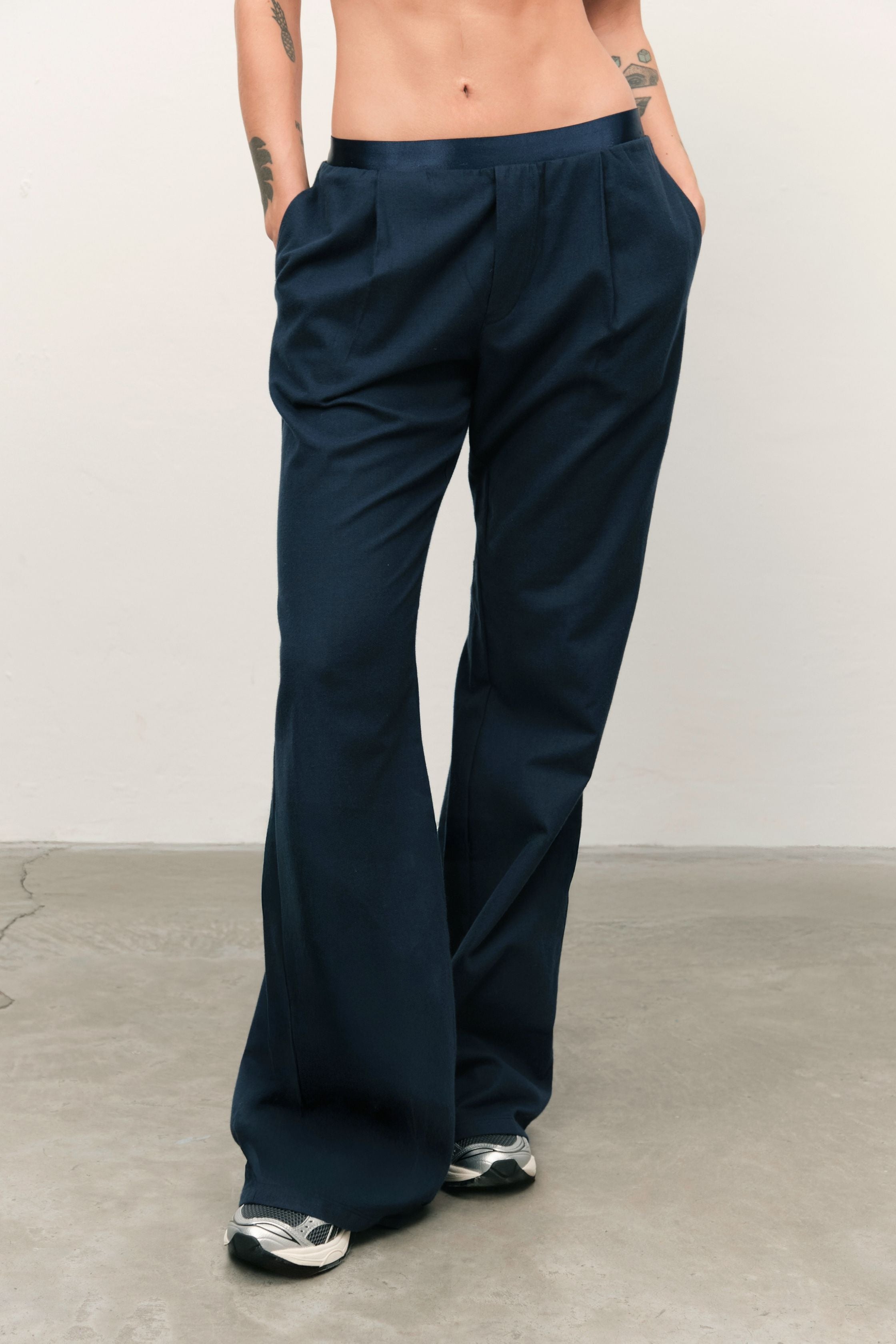 These cashmere-blend cotton trousers offer all-day comfort with their soft texture and relaxed fit. Thanks to their navy tone, they easily match with many pieces and serve as a practical option suitable for both everyday outfits and professional settings.